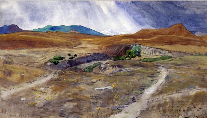 В Калугу акварель «Горный пейзаж» была передана из музейного фонда в 1946 году. Очень тонко на картине написана зелень – здесь преобладает холодный зеленоватый цвет со «вспышками» желтых цветов. Вообще в работе все умеренно, сдержанно и гармонично, что передает предгорный вид, наполненный суровой красотой. Прекрасно проработан передний план с его оврагами, дорожками, цветами, камнями и, конечно, общей панорамой перевала.