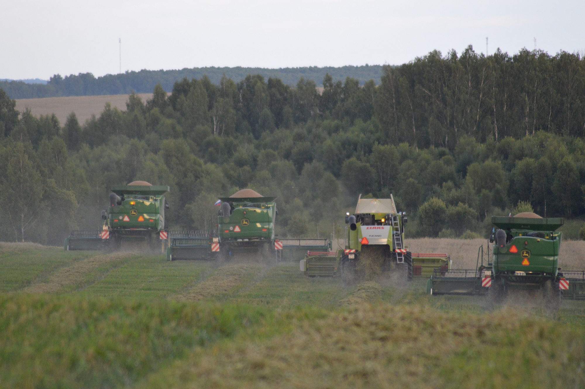 Предприятие обладает всем набором мощной современной техники для того, чтобы в сжатые сроки и качественно убирать хлеба. На жатве задействованы шесть комбайнов Claas Tucono и JD630i. Следуя в ряд друг за другом, они оставляют после себя сжатую полосу колкой стерни шириной 48 метров. Как далеко зашёл прогресс! Несколько десятилетий назад мы радовались «Енисеям», «Донам», а нынешние машины значительно точнее, мощнее и удивляют своими размерами. Они, как большие корабли, только плывущие по хлебной ниве. А управляют ими квалифицированные механизаторы.