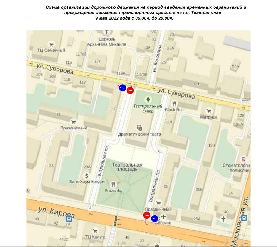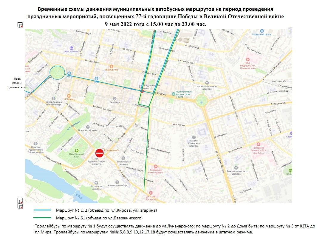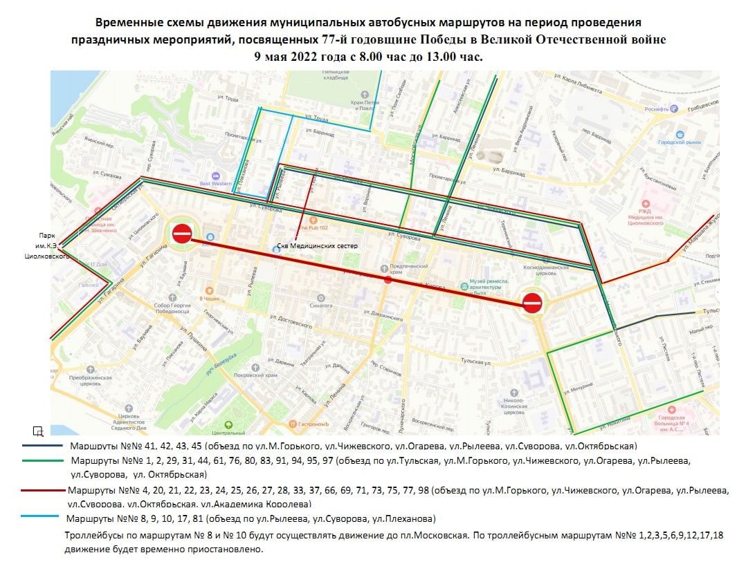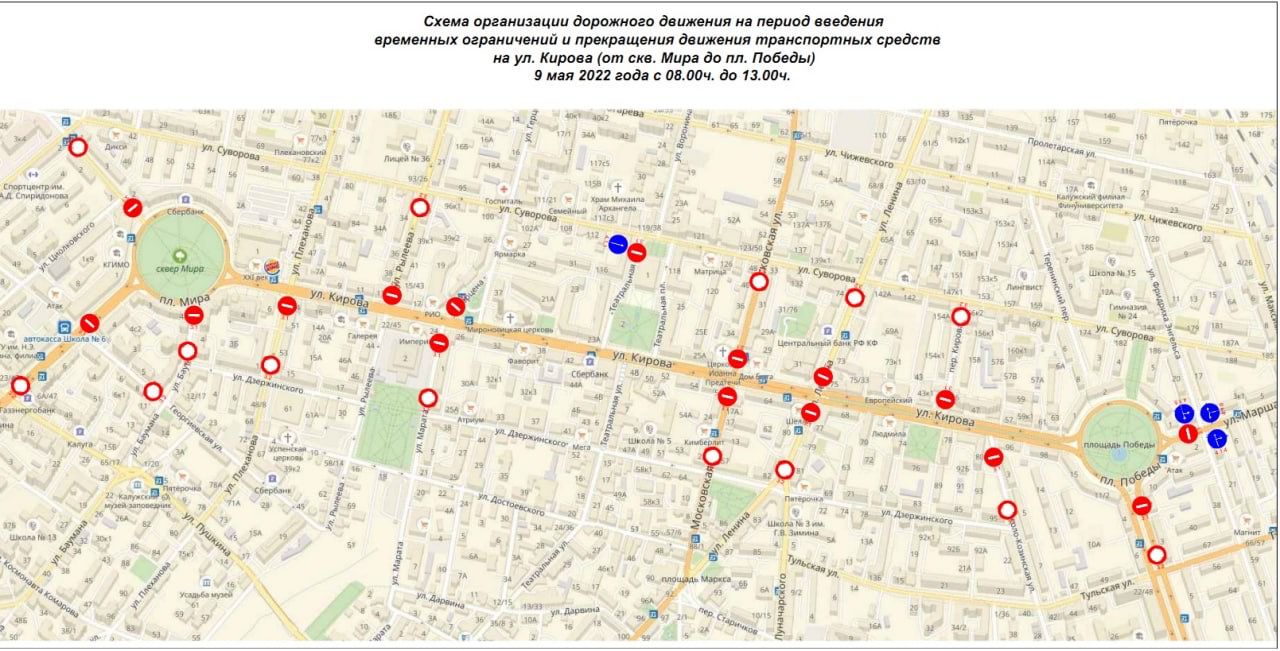 Из-за городских мероприятий, посвященных 77-й годовщине Великой Победы, 9 мая в центре Калуги ограничат движение. Как сообщает служба городского хозяйства, с 09:00 ч. до 20:00 ч. перекроют Театральную площадь, с 08:00 ч. до 13:00 ч. – улицу Кирова от сквера Мира до площади Победы, а с 15:00 ч. до 23:00 ч. движение ограничат на площади Старый Торг.