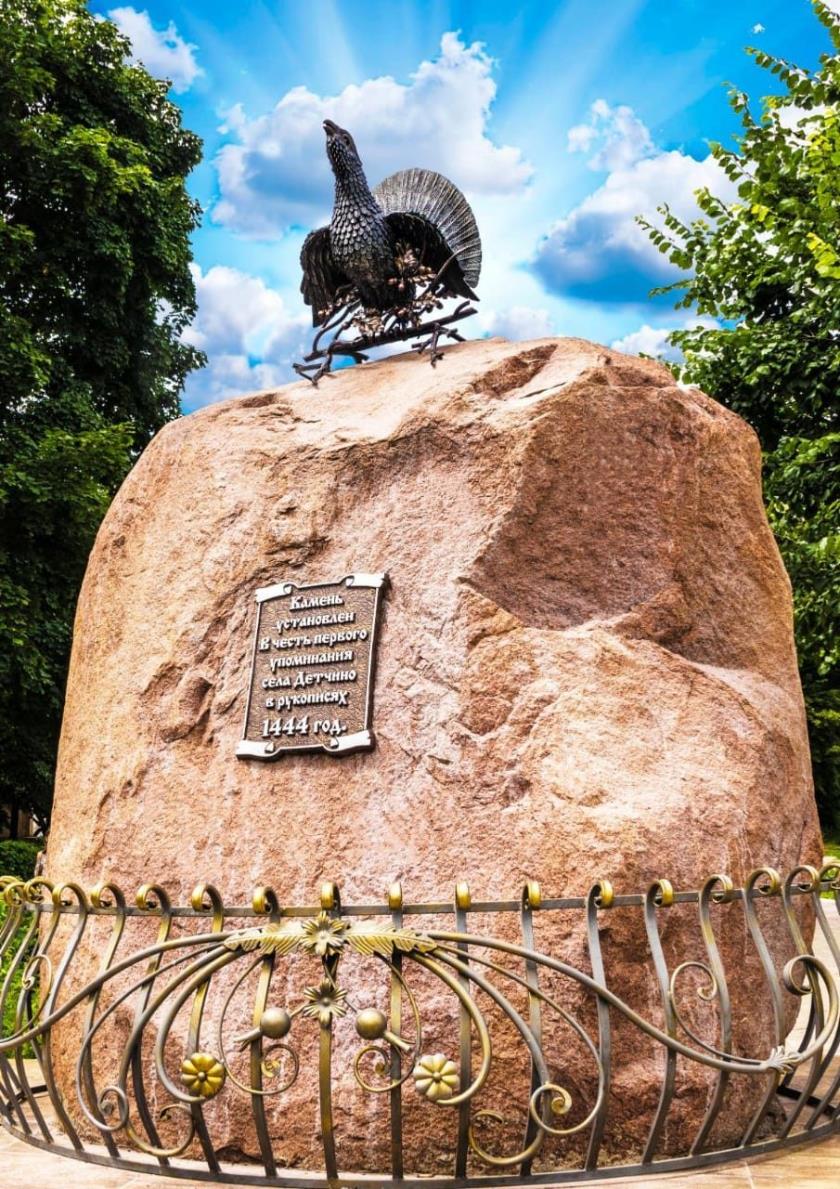 Своим памятным символом-птицей обзавелось и село Детчино в соседнем Малоярославецком районе. Отныне там на огромном памятном камне с достоинством воссел необычный красавец-глухарь, убеждающий своим величественным видом жителей ещё больше гордиться историей Детчинской земли и горячее любить малую родину.По одной из легенд, название этого старинного села первоначально произносилось как Дичино, то есть дремучее место, изобилующее дичью. О глухих, непроходимых лесах, окружавших когда-то здешние поселения, свидетельствуют и названия соседних с Детчином деревень: Березовка, Желудовка, Пнево, Бортники, Розлои. Жившие же в этих местах люди традиционно занимались охотой, в том числе на глухарей, тетеревов, рябчиков и уток. Поэтому именно красный токующий глухарь на ярком зелёном поле и украсил утверждённый в сентябре 1999 года герб Детчина.