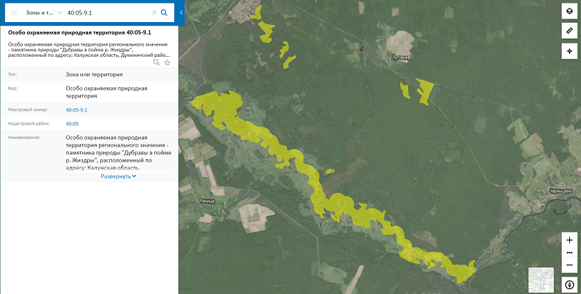 Всего, по состоянию на 18 октября 2021 года, в Единый государственный реестр недвижимости внесено 102 из 148 природных объектов и комплексов, входящих в природно-заповедный фонд региона. Полностью завершены кадастровые работы по особо охраняемым природным территориям регионального значения, расположенным в Жиздринском, Износковском, Кировском, Козельском, Людиновском, Мещовском, Мосальском, Сухиничском, Спас-Деменском, Ферзиковском районах и городе Обнинске. По остальным муниципальным образованиям работа продолжается.