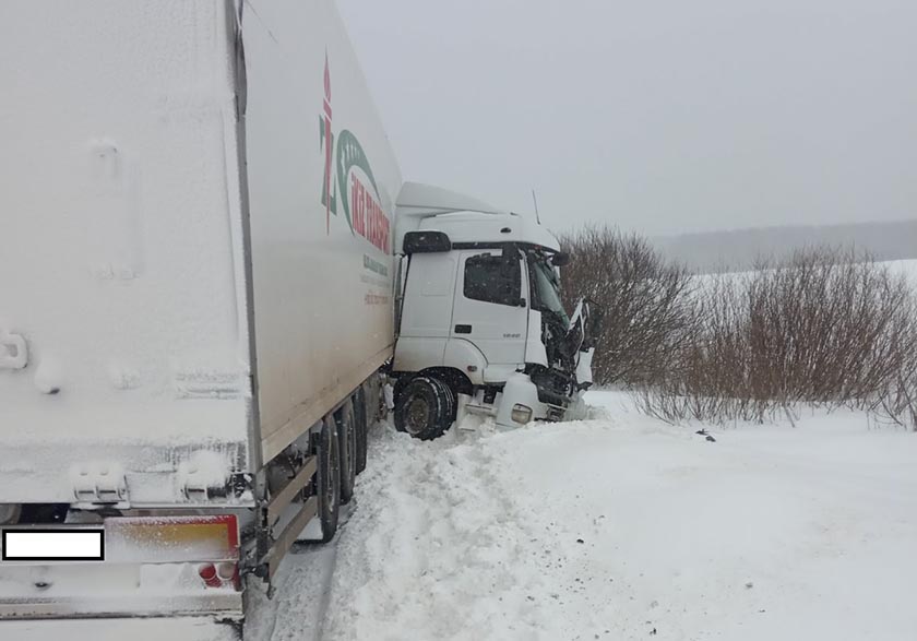 Здесь столкнулись две фуры «Мерседес». В аварии пострадал один человек. Автомобили получили сильные повреждения.