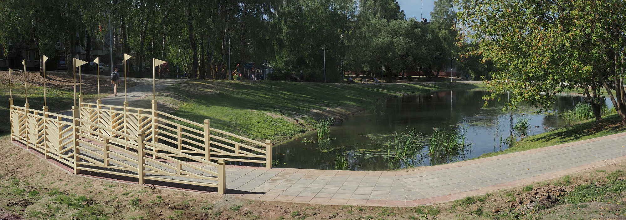 Активисты высадили здесь деревья и кустарники. Ранее территория была благоустроена силами подрядчика: появились игровые площадки, тротуары, освещение. От ила очищен пруд, также там установлен декоративный мостик, точнее, металлические элементы «моста-дамбы». Эта конструкция состоит из крашеного металлического ограждения с флажками и эмблемой «Калуга 650». По центру располагается эмблема «650-летие Калуги».