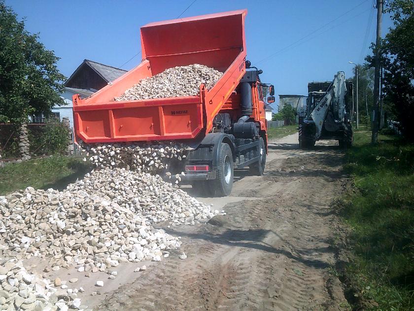 Бригада рабочих строительно-промышленной компании «Век» капитально ремонтирует проезжую часть на улице Горького. Грузовики доставляют крупный щебень, затем экскаватор, снабженный бульдозерной лопатой, разравнивает его по всему полотну дороги. Имея такую надежную щебеночную подушку, дорога приобретает многолетнюю прочность, которой не страшен даже самый тяжелый транспорт.