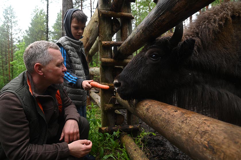 По традиции в национальном парке выпуск зубров - настоящее торжество с почетными гостями, перерезанием зеленой ленточки, последним звонком и «фуршетом» из яблок и морковки для животных.