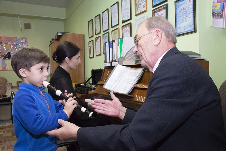 Брат Тимофея Захар Брусанов (на фото в центре) тоже занимается у Владимира Алексеевича. Он – самый маленький воспитанник педагога. И хотя Захару недавно исполнилось шесть лет, он уже неплохо освоил блок-флейту.