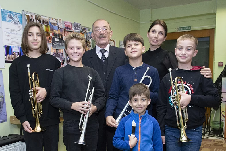 Владимир Бабинцев – настоящий магнит для ребят, они могут подойти к нему даже с личными проблемами. Теплые отношения между педагогом и учениками помогают юным музыкантам добиваться успеха.Тринадцатилетний трубач Егор Киреев (на фото второй слева) признается, что на занятиях ему не дается читка с нотного листа и пока не хватает ритмической дисциплины, которая так важна в музыке. При этом он не теряет энтузиазма.