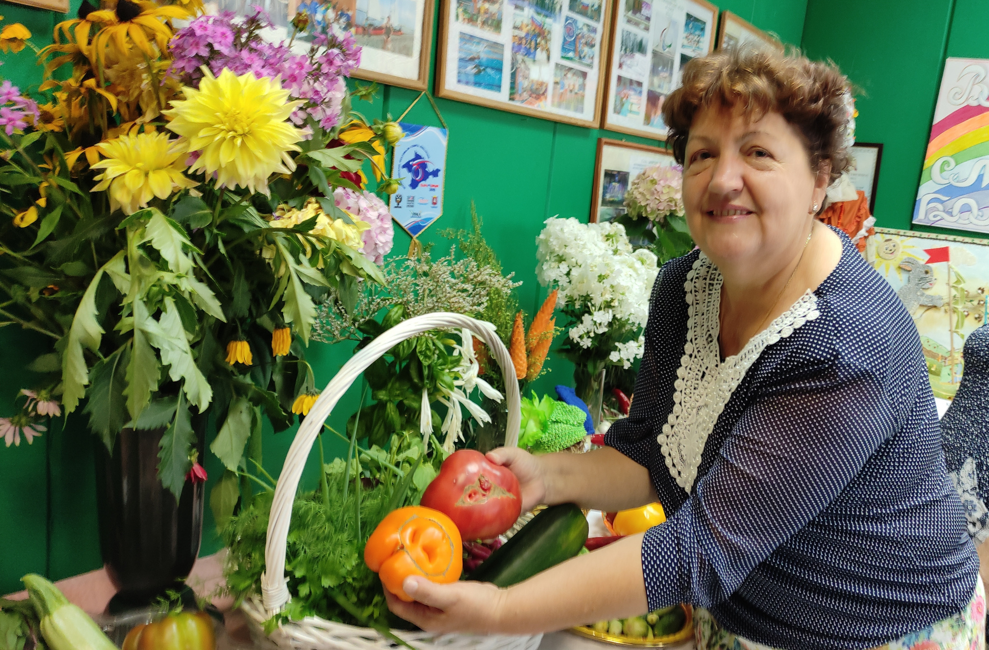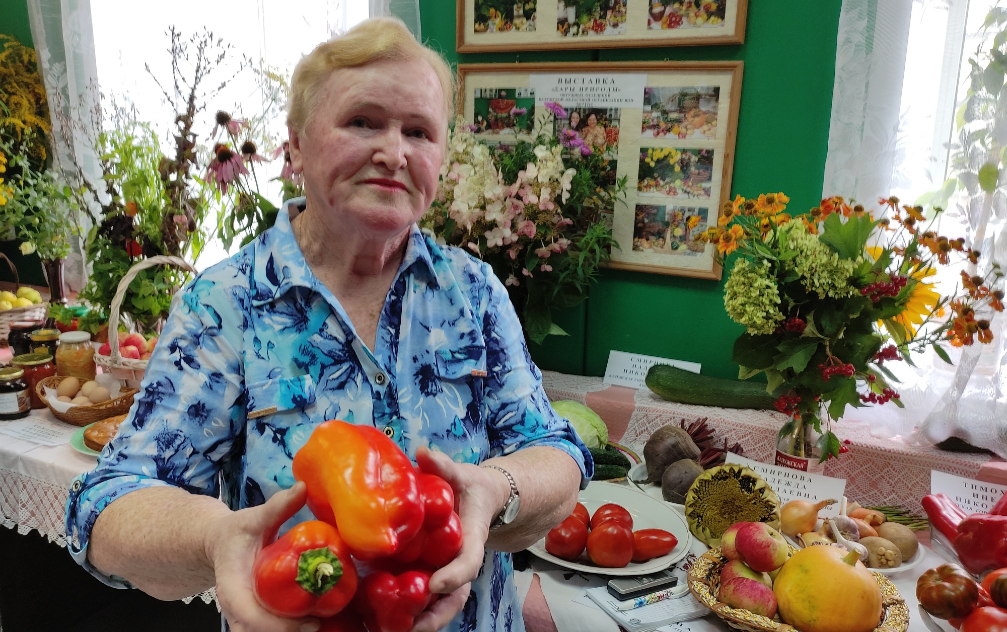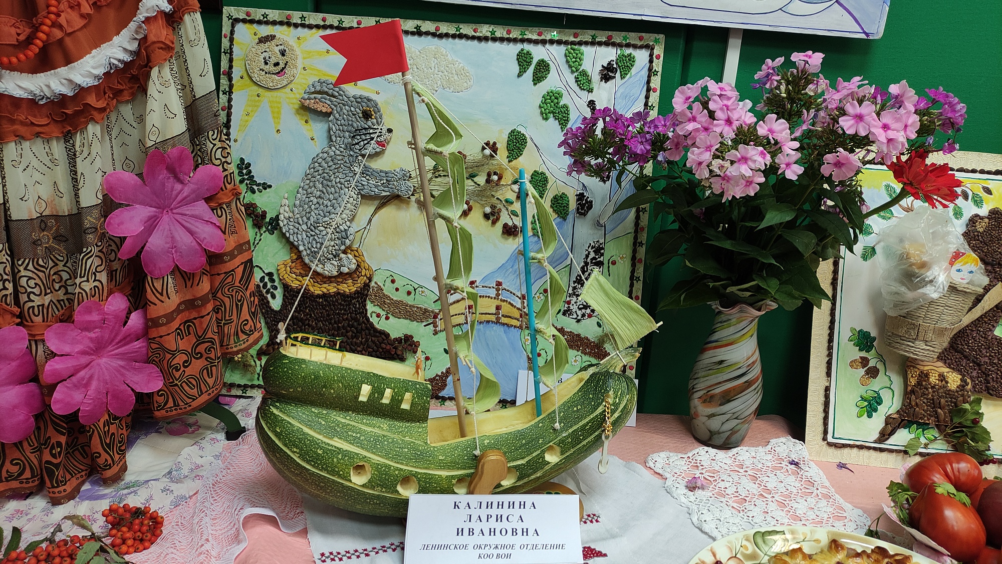 Удались перцы и другие овощи у супругов Бабаевых, а из кабачка они сотворили чудо-кита с фонтаном. Еще один кабачок, сросшийся из двух плодов, вдохновил мастерицу Ларису Калинину на создание корабля. Ларисе и ее маме Зинаиде Васиной нет равных по креативу из природного материала. Нынче Зинаида Михайловна изготовила из семян растений панно, а героиней выставки стала ее ростовая кукла в сарафане, с головой из капусты и в кокошнике, на котором написано: «Кыш, корона! »