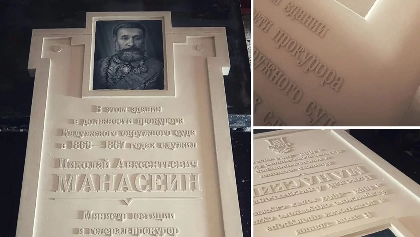 Он сообщил в соцсетях, что предстоит ещё шлифовка и другая обработка поверхностей доски из мелкодисперсного белого бетона с мраморной крошкой. Изображение Николая Манасеина на ней нанесено на керамику, буквы шрифта, детали, декоративные элементы будут отделаны бронзовой эмульсией.