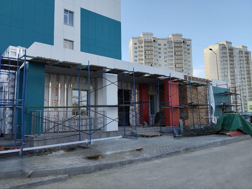 Параллельно на Правобережье строители облицовывают фиброцементыми плитами входные группы поликлиники на Правом берегу. Также приводится в порядок прилегающая к зданию территория и уже высажены первые туи. Внутри здания специалисты продолжают предчистовую отделку помещений.