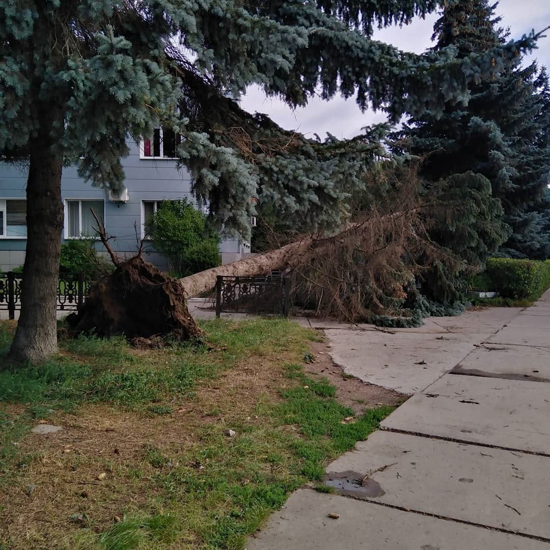 В Кремёнках непогода сломала несколько деревьев. Голубая ель упала рядом со зданием городской поликлиники, и повредила машину «скорой» помощи.