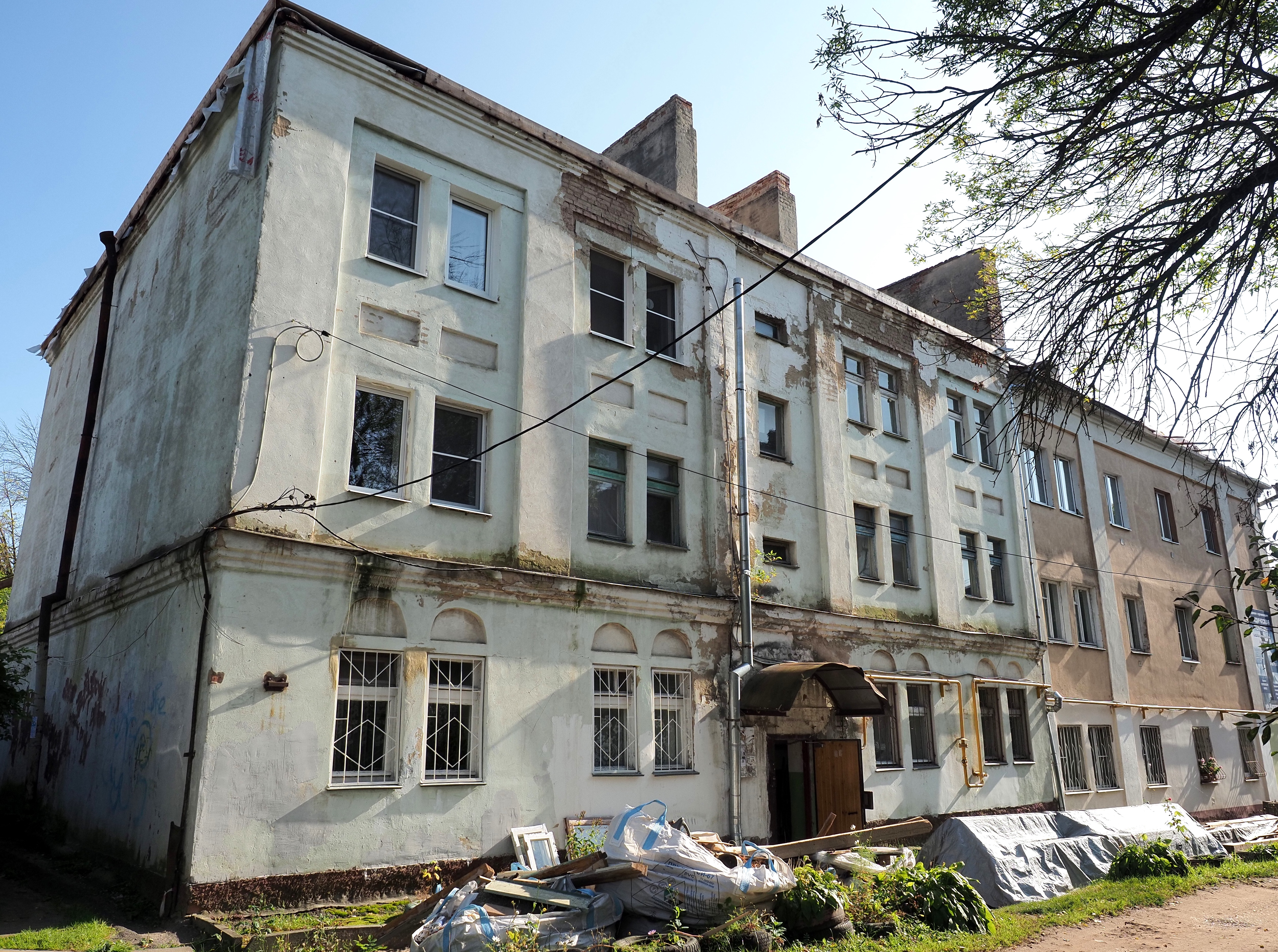 Балки перекрытия, подготовленные на замену, более месяца лежали на улице под дождями рядом со строительным мусором, об уборке которого тоже никто не побеспокоился. Часть разобранной крыши прикрыли плёнкой, а на оставшейся обнажённой кровле не сделали и этого, предоставив верхние этажи дождям. Кстати, подрядчиком на этом доме является ООО «ХЕОПС» (г. Брянск). Но, по информации жильцов, на кровле с весны работали гастарбайтеры, плохо изъясняющиеся по-русски.