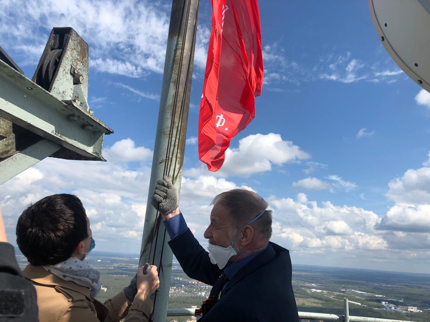 7 мая Знамя торжественно установили на метеомачту и.о. главы администрации города Карина Башкатова и председатель обнинского городского Совета ветеранов Николай Капустин.