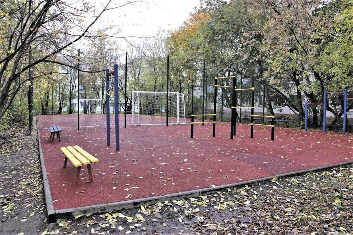 Спортплощадка получилась на славу: здесь уложено резиновое покрытие, обустроены подходы к комплексу, установлены и покрашены ограждения, футбольные ворота, лавочки, урны, обновлено спортивное оборудование (турник, брусья, воркаут).