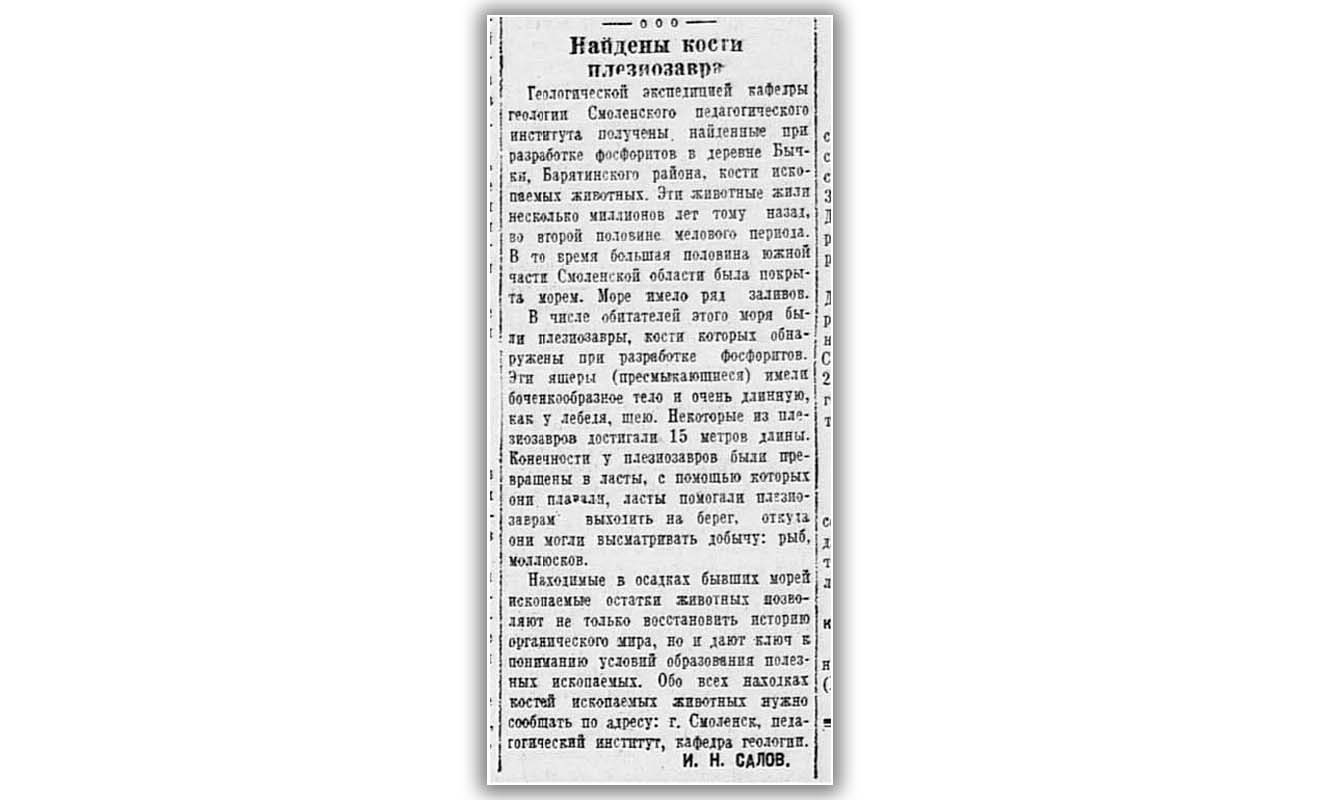 Достаточно открыть геологическую карту Калужской области, чтобы убедиться – под четвертичными (ледниковыми и послеледниковыми) отложениями на юго-западе области залегают породы (пески, фосфориты, трепел), образовавшиеся в Меловом периоде, – это расцвет и окончание эпохи гигантских пресмыкающихся. Особенно интересны с точки зрения палеонтологии фосфориты – серо-коричневые конкреции, сформировавшиеся на дне морских мелководий, вроде дельт и лиманов. Их в огромных количествах добывали до недавнего времени во многих местах для нужд химической промышленности – производства удобрений и т.п. Вплоть до 1960–х годов карьеры и шахты работали в нынешних Кировском и Барятинском районах. Фосфоритами часто замещались попавшие сюда части древних животных и растений. И вот уже настоящая заметка из смоленской газеты 1930-х годов (мне ее переслал турист и краевед Андрей Тимашев): как видите, о находках костей динозавров там говорится прямым текстом! Увы, в середине ХХ века та часть нынешней Калужской области относилась к Смоленской и палеонтологические находки если и попадали в музеи, то наших соседей…