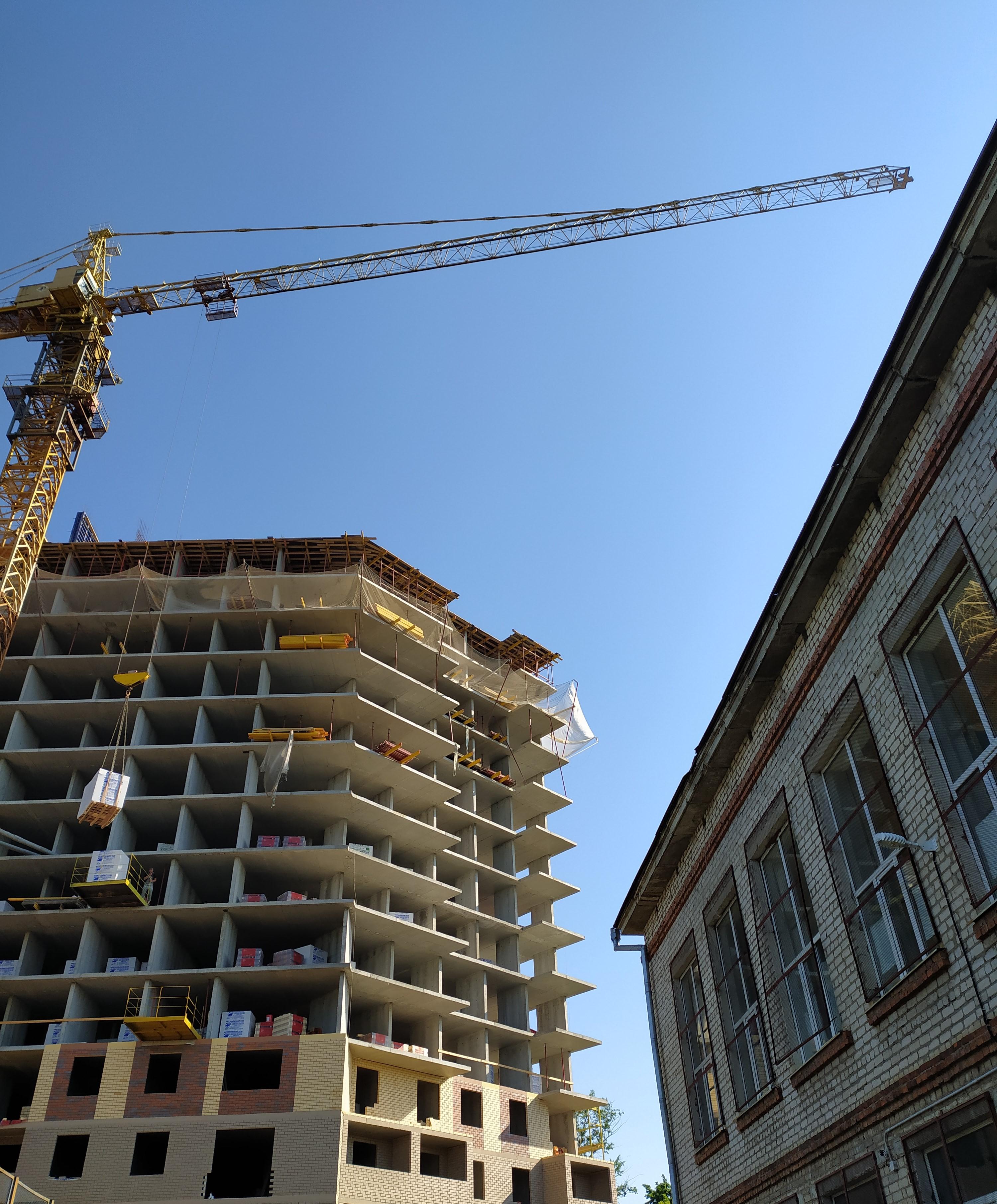 Впрочем, великаном его уже не назовёшь: пальму первенства захванил строящийся через дорогу 25-этажный монстр. И хотя в нём пока не больше 15 этажей, прохожие смотрят на него с ужасом и как-то сжимаются.