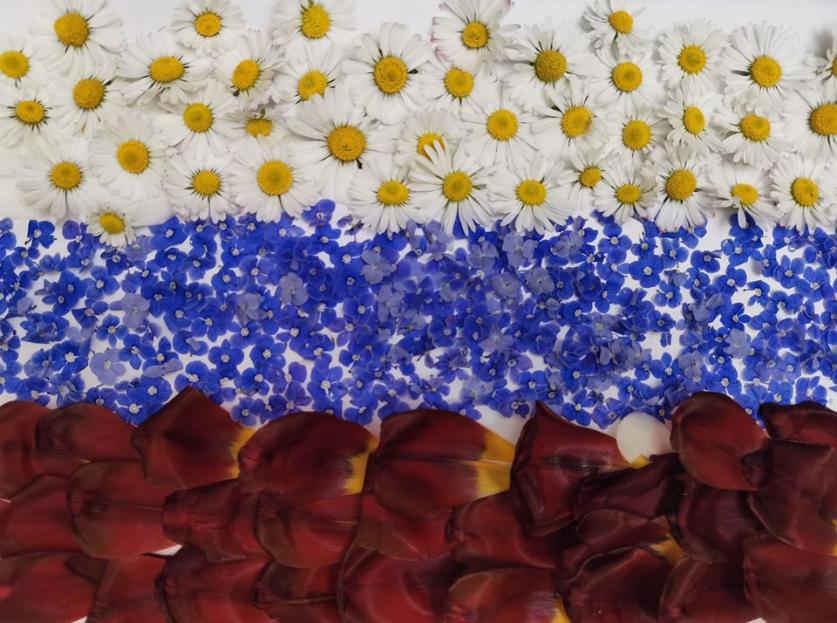 Белый цвет в нем символизировали маргаритки, синий — незабудки и красный — лепестки тюльпанов.