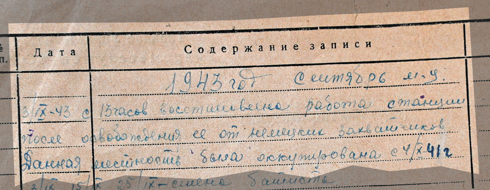 Метеостанция не работала только во время оккупации Спас-Деменска фашистами. В архивах сохранился удивительный документ – страница журнала с записью о начале метеонаблюдений в освобожденном городе.