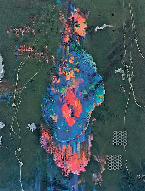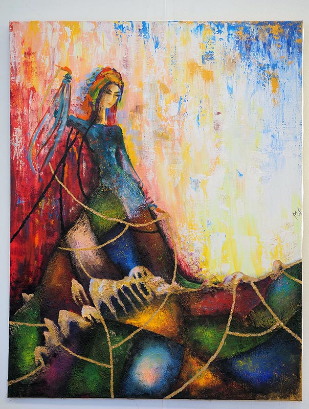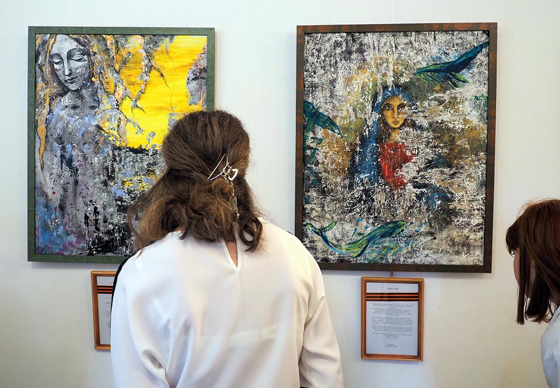 Язык современного искусства очень необычный, это концентрация на внутренних переживаниях, рефлексии, чувствах. Все это выплескивается красками, цветом на полотна. Оттого и названия картин очень философичные и чувственные – «Мироздание», «Дыхание», «Солнечный зайчик», «Рыцарь, спасающий бабочек» и т.д. И практически везде на полотнах среди экспрессивной гаммы чувств и переживаний – женские образы, те, кто остался ждать, хранительницы очага, новые Ярославны. На картине «В омут войны» она изображена слабой и нежной невестой, которой не стать женой, если воины не спасут и не защитят этот мир. Она – в ждущей любимого домой на картине «Солнечный зайчик».