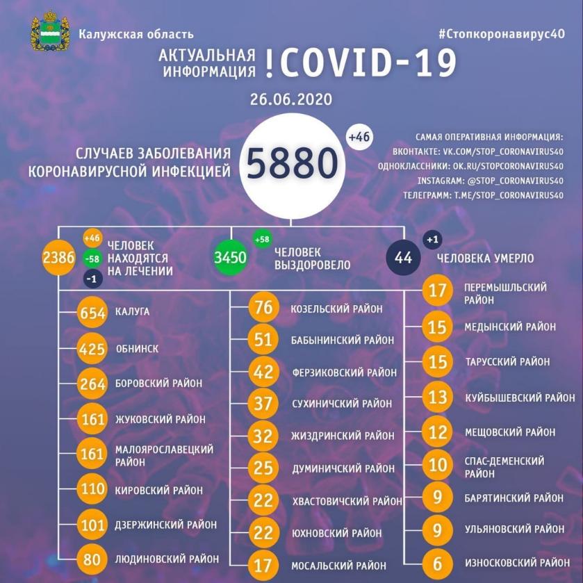 Всего, по обновленным данным, на сегодняшний день в Калужской области зафиксировано 5880 подтверждённых случаев заболевания коронавирусной инфекцией, из них 46 за последние сутки. 3450 человек выздоровело, из них 58 за последние сутки выписаны из медучереждений.