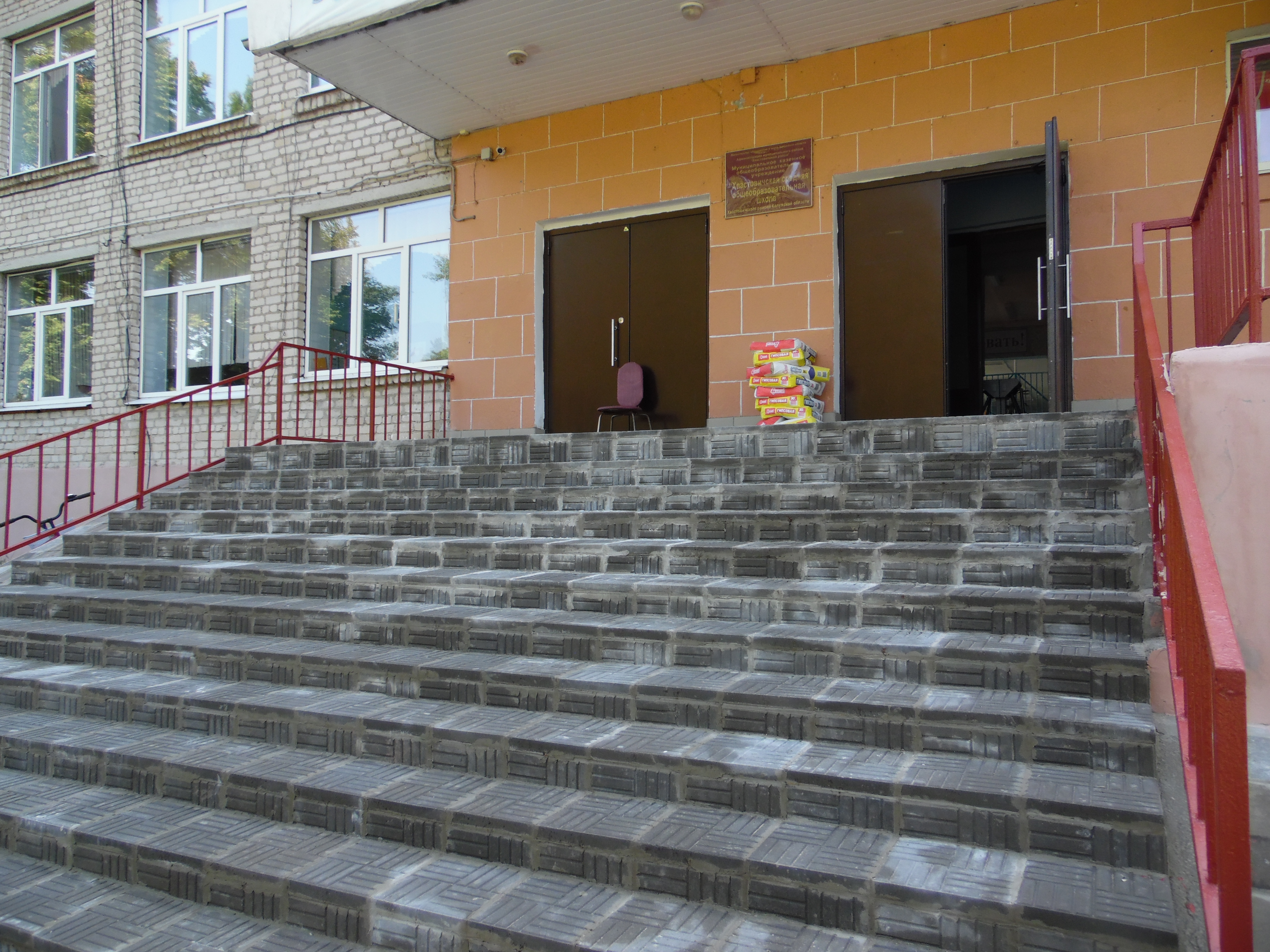Бригада рабочих Хвастовичской МСО провела основательный ремонт фасада здания - стены оштукатуривали и выравнивали. Были обновлены и подправлены отмостки. Полностью сделали капитальный ремонт парадного крыльца здания. В школе порог высокий, ступеньки широкие, они должны быть удобными и безопасными для детей. Бригады работали добросовестно, всю работу выполняли качественно и в срок.