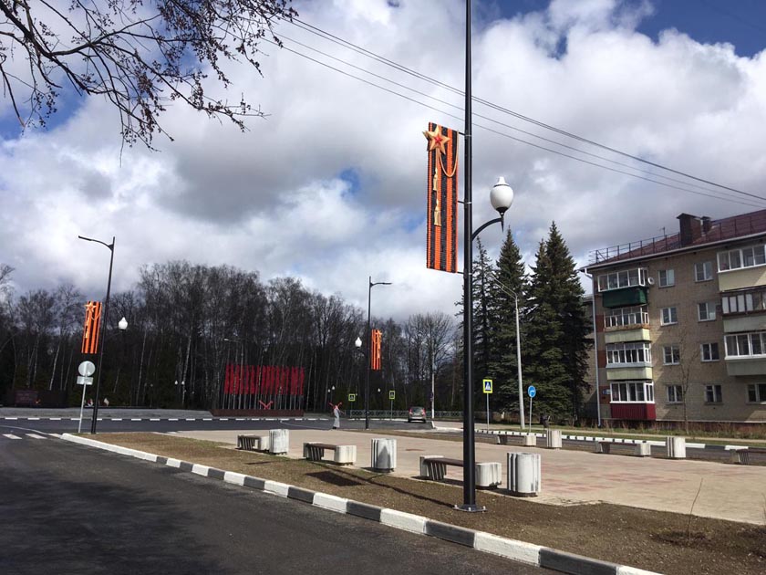 Как сообщили в администрации наукограда, в пятницу на новых световых опорах по ул. Жукова установили декоративные конструкции из пайеток в виде Георгиевских лент, украшенных звездами и аксельбантами.