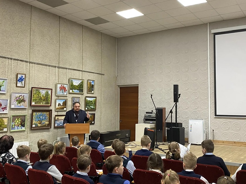Роман Владимирович рассказал ребятам о том, почему Калугу называют колыбелью космонавтики, о приезде Юрия Гагарина в Калугу, о том, почему именно в Калуге был открыт Музей космонавтики.