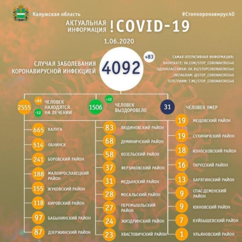 В период пандемии коронавирусом в Калужской области заболели 4092 человека. Такова статистика по числу подтвержденных случаев инфицирования на 1 июня.