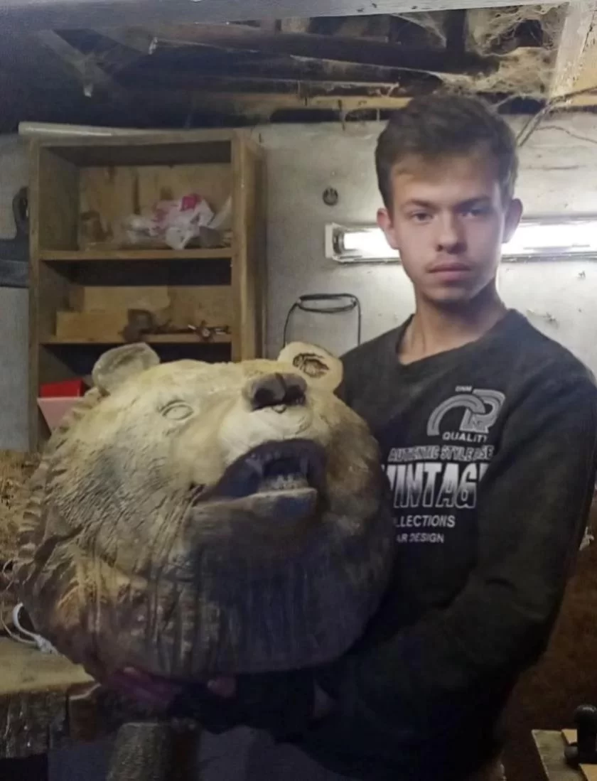 Вторая мастерская – в старом гараже, где места заметно больше. Там краснодеревщик делает массивные столы, другие предметы интерьера. И скульптуры тоже – например, вот эту большую зубастую медвежью голову (на снимке). Ее Павел начал вырезать еще до Нового года – по сыроватому дереву, в свободное время, постепенно. Делал для себя, на стену над камином. Сейчас медведь уже практически готов – он долго сушился в беседке.