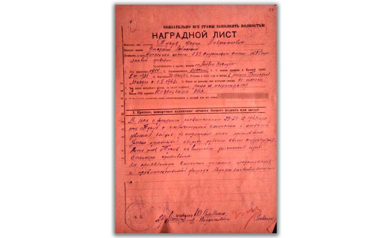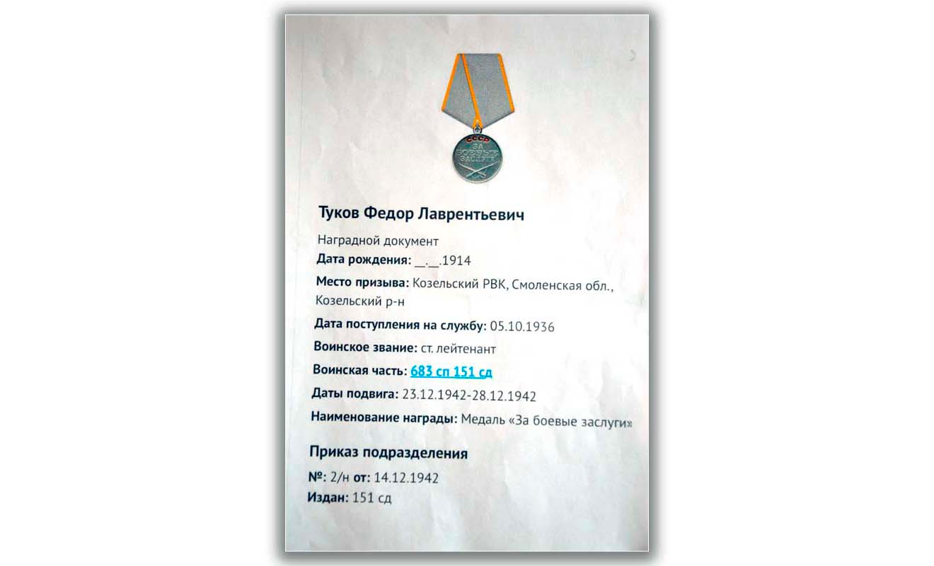В этом году внучка Елена наконец разыскала сведения о старшем лейтенанте Тукове в Центральном архиве Министерства обороны РФ в Подольске. Выяснилось, что воевал он геройски, за что был награжден орденом Боевого Красного Знамени и медалью «За боевые заслуги». В наградном листе говорится: «Товарищ Туков с исключительной смелостью и отвагой увлекал бойцов на отражение атак противника. Умело организовал оборону рубежа своего подразделения. Лично из винтовки уничтожил три снайпера противника». Погиб Федор Лаврентьевич 28 января 1943 года при освобождении села Калниболотское в Краснодарском крае.