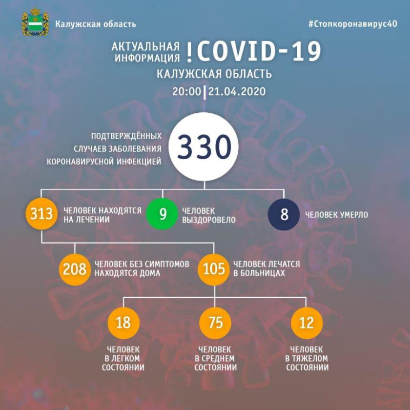 В настоящее время в больницах проходят лечение 105 жителей области, 12 из них в тяжелом состоянии, состояние остальных врачи оценивают, как средней и легкой степени. Девятерых калужан медики вылечили, они отправились домой. 208 человек, получившие положительный анализ на наличие коронавирусной инфекции, находятся дома, заболевание протекает у них без симптомов.