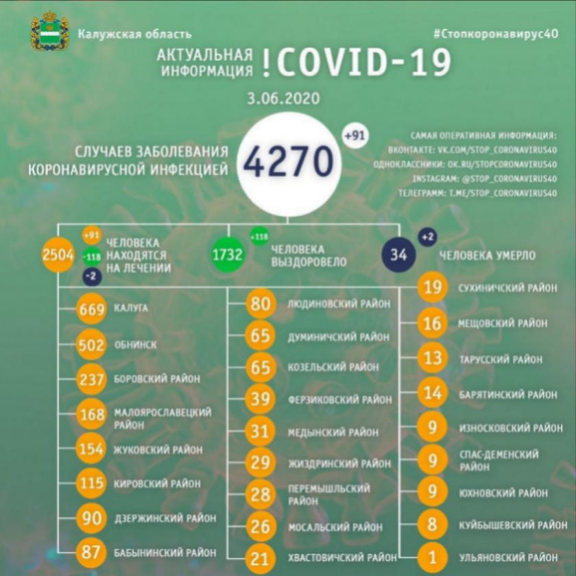 По состоянию на 3 июня всего наблюдается 4270 подтвержденных случаев заболевания коронавирусной инфекцией, из них 91 за последние сутки.