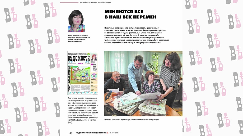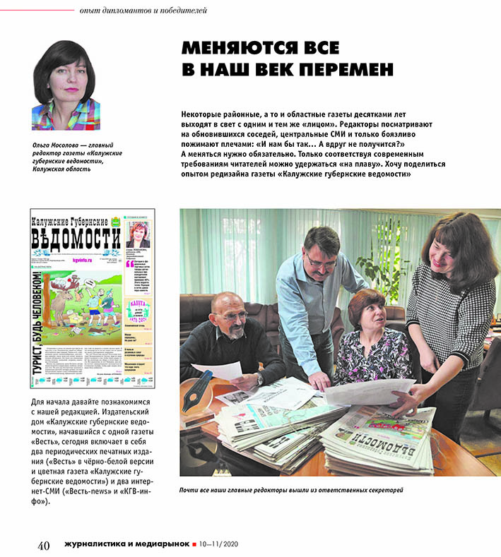 Вышел свежий номер журнала Союза журналистов России «Журналистика и медиарынок», посвященный победителям и дипломантам конкурса «Вся Россия-2020». Напомним, что газета «Калужские губернские ведомости» заняла в конкурсе второе место в номинации «Газетный дизайн». Ольга Мосолова, исполняющая обязанности главного редактора издания, поделилась в выпуске редакционным опытом редизайна газеты. Также на страницах журнала выступила наша коллега Марина Карама, главный редактор «Мосальской газеты» - лауреат этого конкурса.