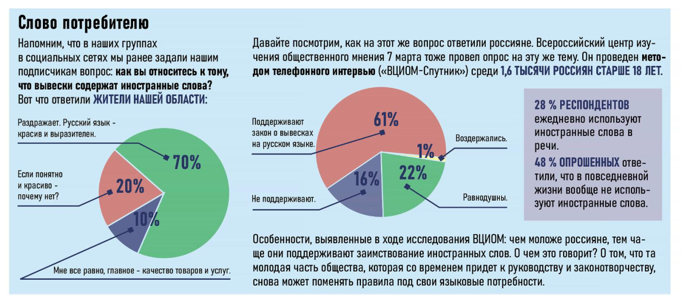 Цель федерального закона, который в народе назвали «Законом о защите русского языка», — сделать публичную информацию понятной для всех потребителей. Он устанавливает ограничения на необоснованное использование иностранных слов на вывесках, рекламах, указателях. Интересно, как это работает и работает ли вообще?