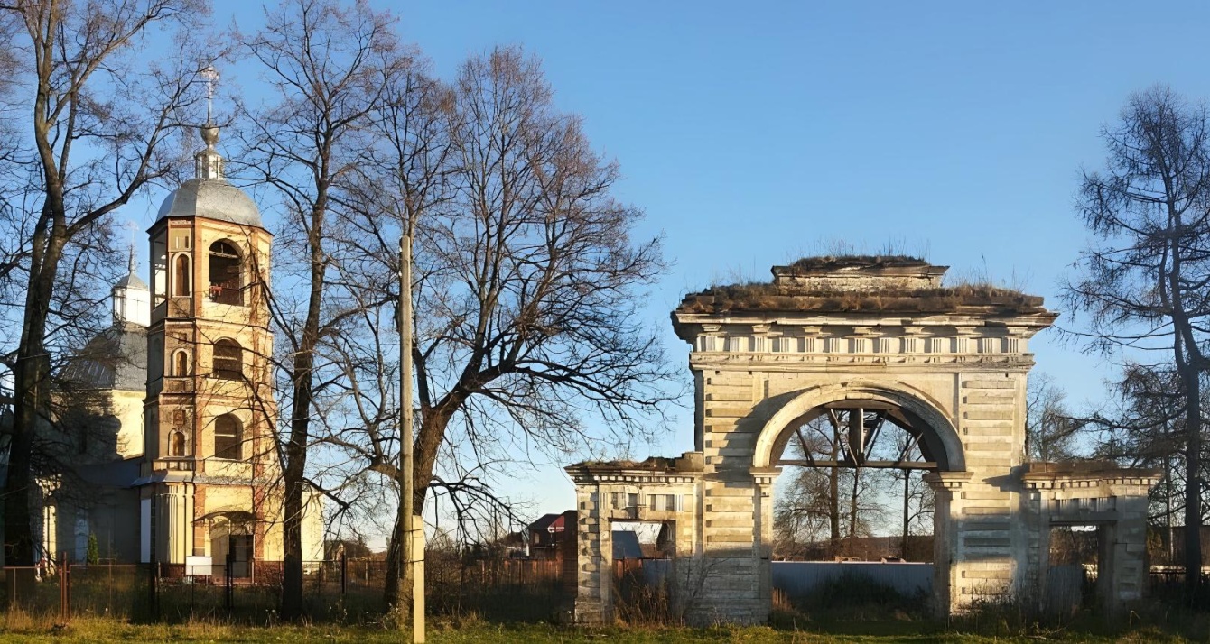 Что сохранилось? Два заброшенных двухэтажных флигеля последней трети XVIII века в стиле раннего классицизма, «триумфальная» арка въездных ворот (существует версия, что их автор — архитектор Василий Баженов), церковь, построенная в стиле барокко по проекту и на средства Екатерины Дашковой, старый некрополь возле церкви, остатки парка в западной части усадьбы и вдоль реки Протвы, фундамент господского дома.