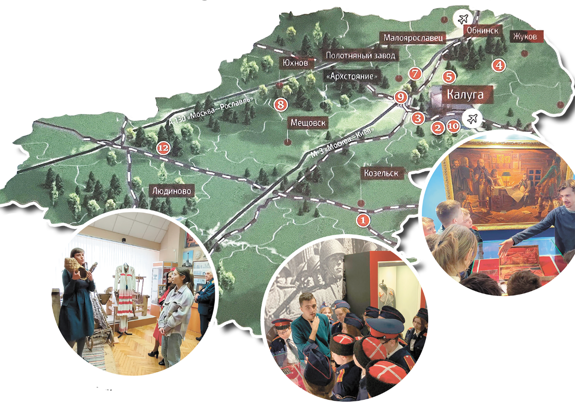 Очень насыщенны и востребованы у юных калужан экскурсионные туры по местам сражений Отечественной войны 1812 года: Тарутино, Малоярославец, Черноостровский Свято-Никольский женский монастырь, «Людиново - город воинской славы и трудовой доблести», «Цветаевская Таруса». Недавно была организована экскурсия в учебный центр подготовки моряков-подводников в Обнинске, где расположен музей боевой славы ВМФ. Интересен калужанам экскурсионный тур в Медынский район с посещением киностудии «Военфильм» и музея военной техники Задорожного.