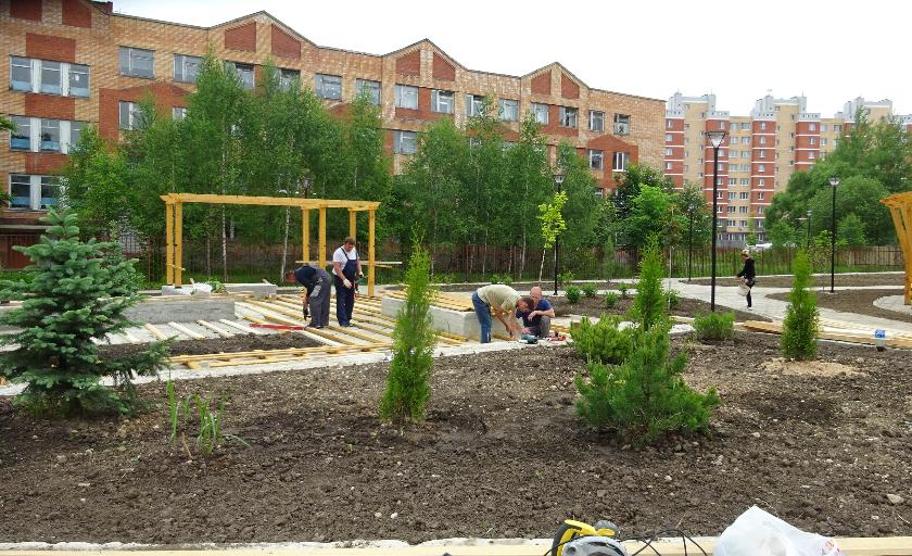 На минувшей неделе мы отправились посмотреть, как идут работы. Первое, что бросилось в глаза: какое уютное место выбрано для сквера! Оно находится в периметре, который обрамляют здание школы и высотные жилые дома.