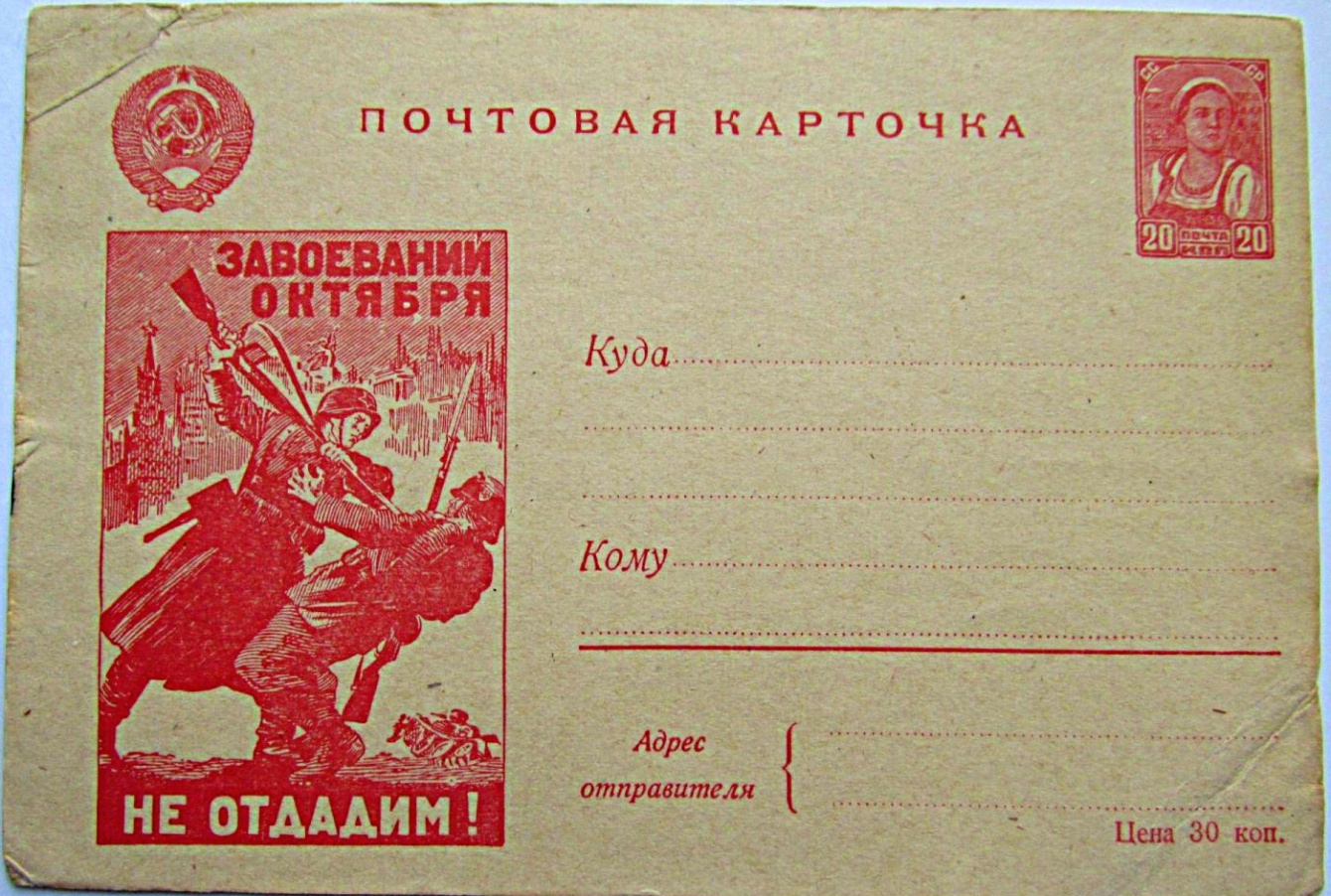 Любые открытки того времени несли агитационный характер, поддерживали боевой дух солдат и населения: военные рисунки, цитаты Сталина с призывом громить фашистов, патриотические стихи.