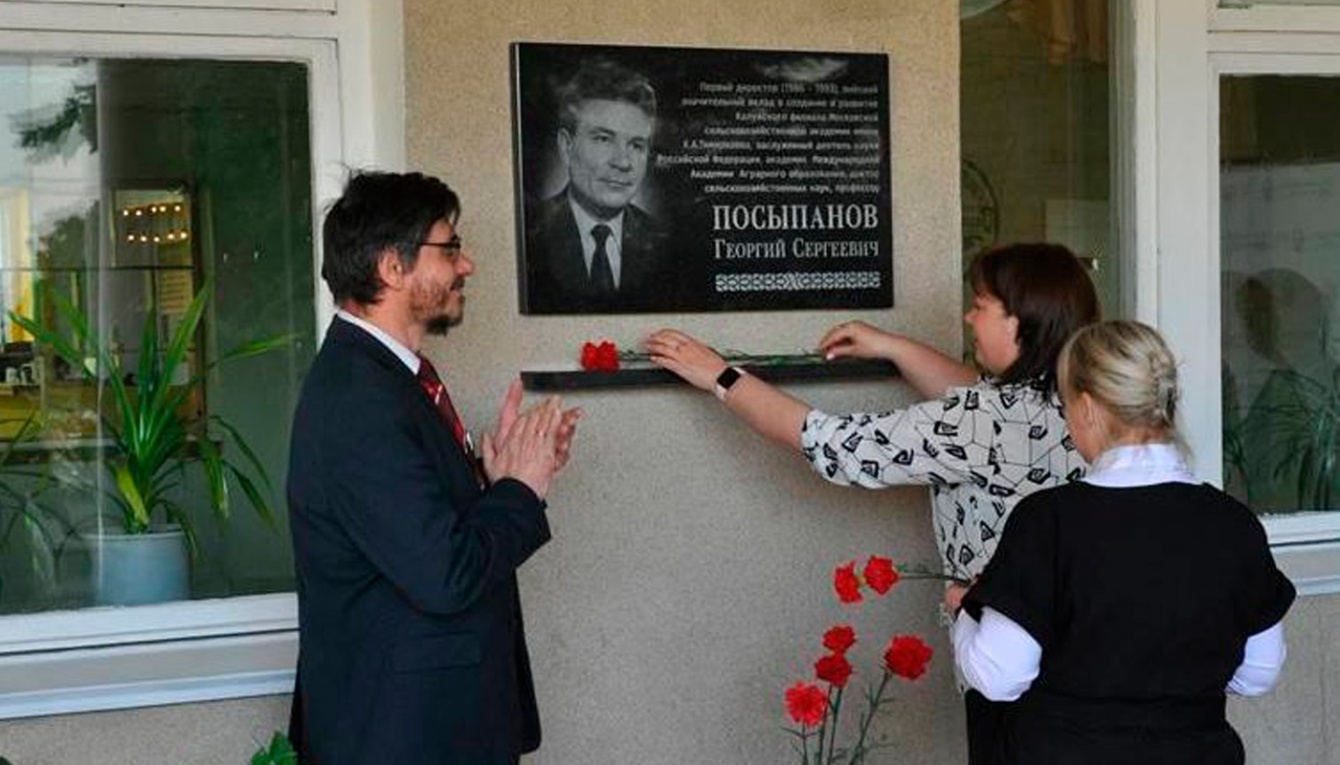 Мемориальную доску открыли директор Калужского филиала РГАУ-МСХА имени К.А. Тимирязева Светлана Малахова и сын Посыпанова Олег Георгиевич. К ней возложили цветы представители региональных министерств сельского хозяйства и образования и науки.