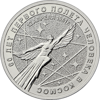 Оборотную сторону украшает рельефное изображение летящей фигуры человека с крыльями на фоне звездного неба. На монете можно увидеть две надписи - «12 апреля 1961 г.» и «60 лет первого полета человека в космос».