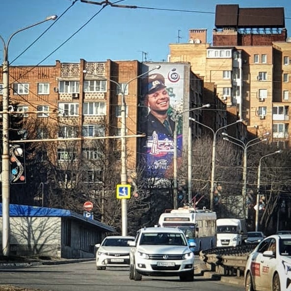 «Навстречу 12-му апреля! Смонтирован юбилейный баннер на улице Гагарина, оформленный согласно брендбука к 60-летию Первого полëта человека в космос».