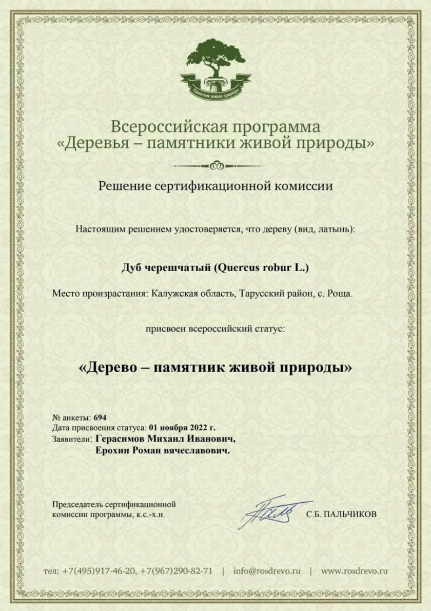 Почетный статус «Зеленый гигант» получил решением сертификационной комиссии Всероссийской программы «Деревья - памятники живой природы». Рощинцы ждали, что их достопримечательность будет отмечена: заявку в программу местные жители Михаил Герасимов и Роман Ерохин подали еще несколько лет назад. Для дуба, впрочем, какие-то четыре человеческих года - вовсе не срок. По оценкам, возраст его может составлять несколько столетий!