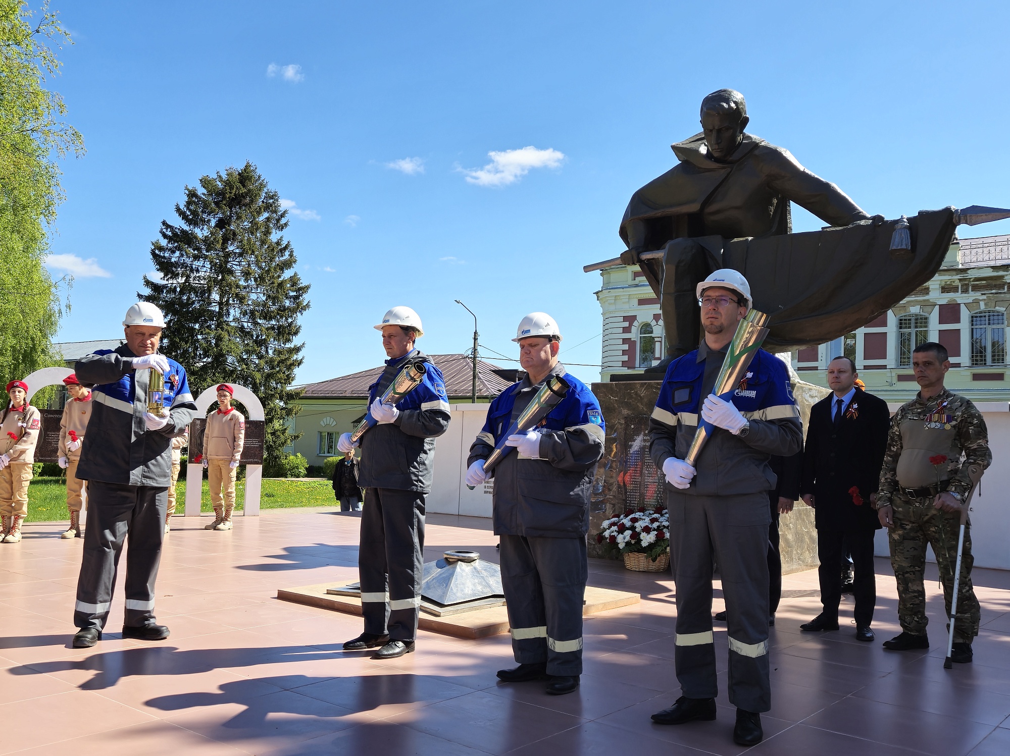 Торжественную церемонию передачи огня доверили лучшим сотрудникам филиала «Газпром газораспределение Калуга» в Козельске Павлу Свечникову, Александру Сорокину и Павлу Первушину. Они зажгли свои факелы от лампады, пламя которой было доставлено из Калуги от мемориального комплекса с Площади Победы.