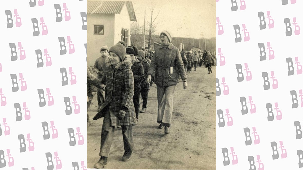 1981 год. Галина Семеновна и ее 3 В из калужской школы № 16 идут на субботник с песней «Вместе весело шагать».