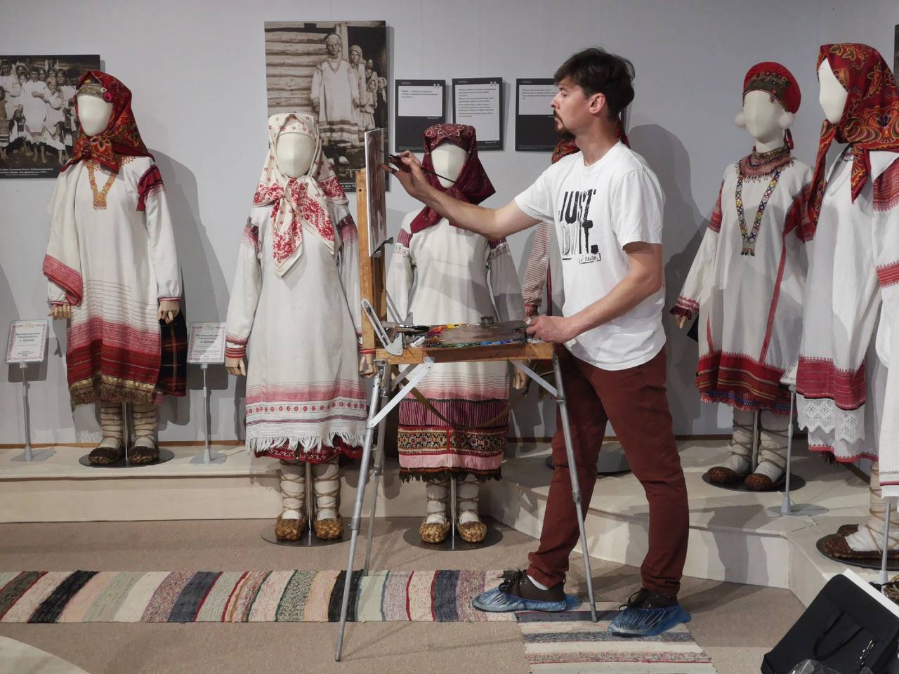 - Мы приехали на пленэр всей семьей: с мужем, дочкой и даже собакой. И, конечно, я привезла всех своих учеников. Удивительно радушный прием, очень понравилось работать в этнографическом музее. Я поразилась, насколько костюм может изменить человека, – из современных подростков в курточках и джинсах наши модели преобразились в девушек-лапушек из прошлого. Очень красивые места. К сожалению, писать их уже не хватило времени, поэтому лелеем мечту побывать здесь еще раз.