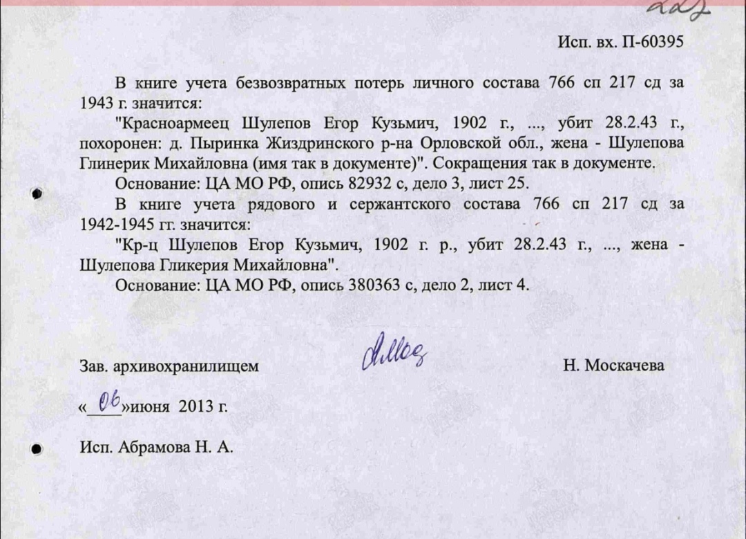 «Дед – сибиряк, у него была бронь, как у отца шестерых детей. Но в 1942-м он снял бронь и ушел из Красноярска на фронт добровольцем. Был сильным человеком, самобытным художником, слал со службы жене, моей бабушке, письма с рисунками… Погиб 28 февраля 1943-го в своем первом бою, ставшем для него последним»,
