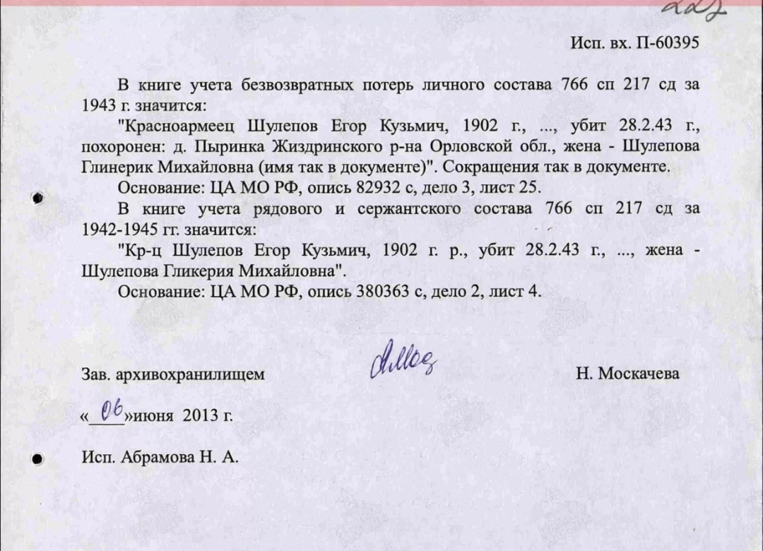 Елена отправила по электронной почте письмо главе администрации сельского поселения «Деревня Высокое» Анне Иванчуковой. Ответ пришёл быстро: да, красноармеец 766 стрелкового полка 217 стрелковой дивизии Егор Кузьмич Шулепов похоронен в Братской могиле с.Высокое, Думиничский район Калужской области. Сюда его останки были перенесены из могилы в Пыренке.