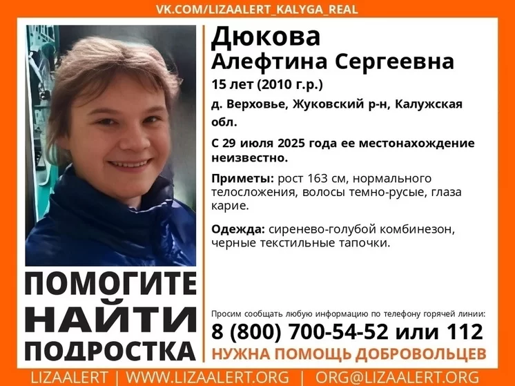 Как сообщают волонтеры поискового отряда «Лиза Алерт Калуга», 29 июля в деревне Верховье перестала выходить на связь 15-летняя Алефтина Дюкова.