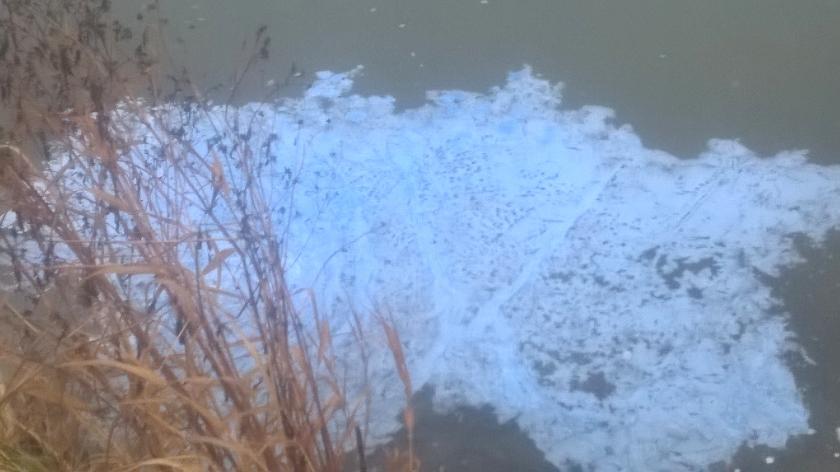 Неплохое пятно образовалось, метра два. То ли сами маляры вылили, то ли они легкомысленно бросили банку с краской на берегу, и ее нашли гулявшие здесь дети, решившие похулиганить. Там же в кустах неподалеку валяются испачканные краской перчатки и кисть.Убедительная получилась демонстрация программы «Чистая вода»!