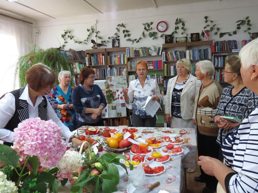 В этот день столы в читальном зале библиотеки превратились в один большой выставочный стенд, украшенный садовой икебаной и «облаками» гортензии. Дизайн – от главы клуба «уДачный мир» Светланы Егоровой. В зелёном букете можно увидеть румяные яблоки, грецкие орехи, фундук, садовую малину с участка садовода. На столе самые яркие овощи лета – томаты! Ядрёно-желтые и алые, ярко-красные и зелёные, темно-фиолетовые и пятнистые, даже иссиня-чёрные!На тарелках лежат маленькие бусины, будто снятые с ожерелья принцессы. Есть желтые помидоры, похожие на мини-бананы. На тарелке не умещаются огромные помидоры-рекордсмены, каждый из них – с полкилограмма и более. Специально для романтиков – томаты в форме сердца с ярко-выраженными геометрическими формами.